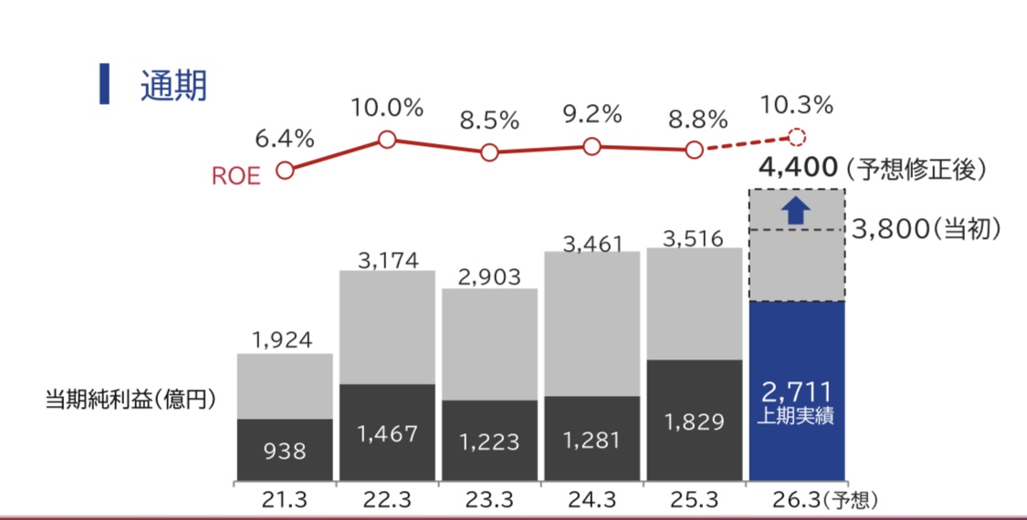 当期純利益予想 3,800億円 → 4,400億円(+15.8%)へ上方修正