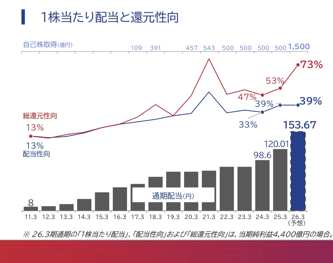 通期配当予想 132.13円 → 153.67円へ上方修正(前期実績120.01円)