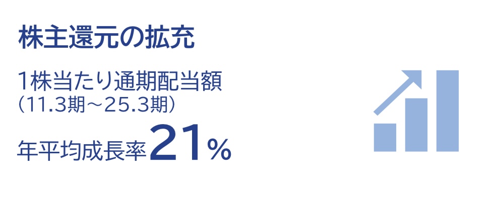 1株当たり通期配当額(11.3期〜25.3期)は年平均成長率21%です。